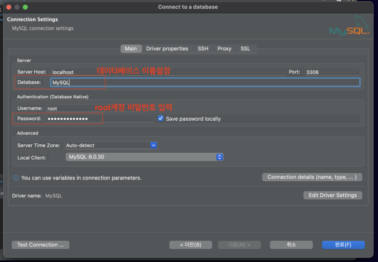 7.밑에 데이타베이스 이름작성 & root계정 비밀번호 입력하고 완료 누르기.
