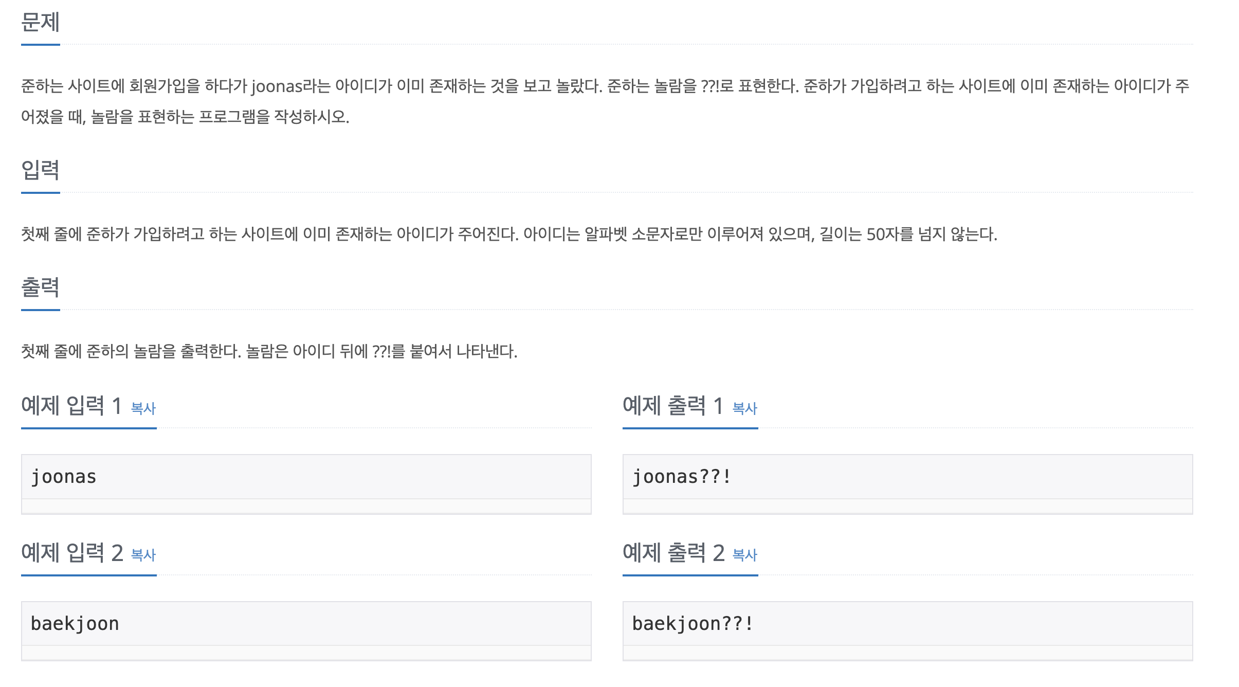 준하는 사이트에 회원가입을 하다가 joonas라는 아이디가 이미 존재하는 것을 보고 놀랐다. 준하는 놀람을 ??!로 표현한다. 준하가 가입하려고 하는 사이트에 이미 존재하는 아이디가 주어졌을 때